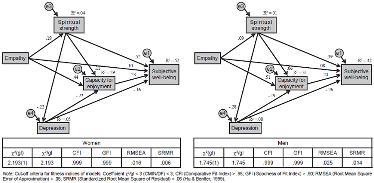 Results: Both models successfully fit the data and explained a high proportion of the SW variance. Spiritual strength was the best predictor, mainly for women, while the capacity for enjoyment was central to the models, mediating the effect of empathy and depression.