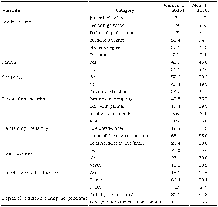 Table 1 shows that the preponderant levels of educational achievement for men and women were undergraduate and graduate degrees. About half had a partner, and one in two had one or more children and lived mainly with their partner and offspring or with their parents and siblings. A higher percentage of men (22.6%, n = 261) than women (16.5%, n = 596) were the sole breadwinner, while more women (20.4%, n = 737) than men (18.8%, n = 217), did not contribute financially to the family, although they were engaged in paid employment. Seven out of 10 had social security. Over half the sample lived in the center of the country (Mexico City, State of Mexico, Guerrero, Hidalgo, Morelos, Puebla, and Tlaxcala). At the time of answering the instruments, 19.9% ( n = 719) of women and 15.2% ( n = 176) of men said they were under total lockdown. The remainder declared they were under partial lockdown, as they had to go out to make basic purchases or for medical consultations.