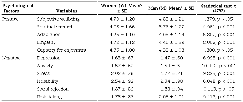 The mean scores of women for depressive symptoms, anxiety, stress, and irritability were significantly higher than those of men, who scored higher in risk taking. No differences were found by sex in social rejection. In general, scores were below the theoretical mean.