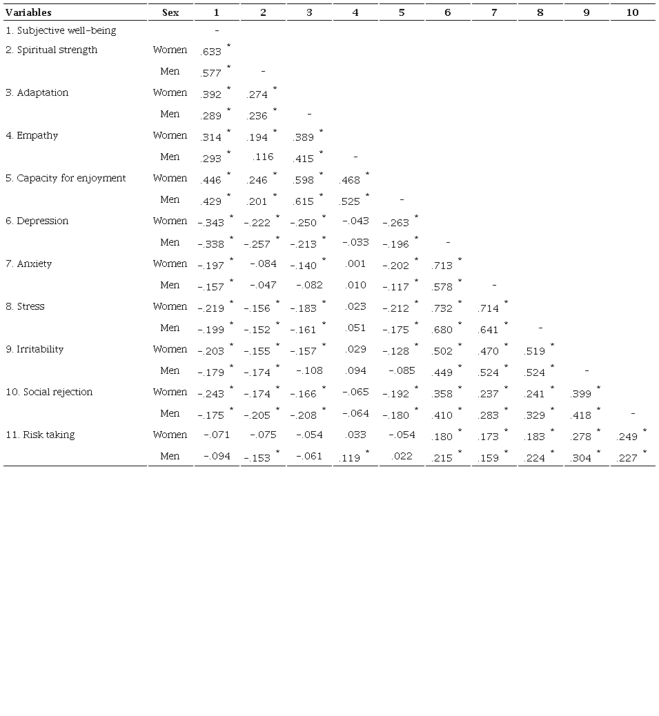 Significant correlation indices were obtained for all the variables with SW, except for risk-taking, whose indices were close to zero, in both men and women. The highest positive correlations were observed with spiritual strength and the capacity for enjoyment, and the highest negative ones with depression symptoms and stress ( Table 3 ). High correlations (> .70 in women and > .57 in men) were observed between depression symptoms, anxiety, and stress; and between the latter and irritability (> .40). Similar results were obtained with adaptability, empathy, and enjoyment capacity, which correlated moderately with each other, in men and women.