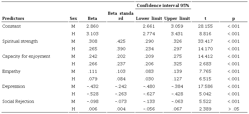 SW predictors were obtained through multiple regression analysis from the correlations. Risk-taking and anxiety were not significant and were excluded from the models. Stress, irritability and adaptability were also eliminated because they were multicollinear, which was quantified and tested with the indices obtained for tolerance (< 1) and variance inflation (VIF > 1). The final model for women explained 48.2% of the variance in SW, whereas for men it explained 41.8%, both of which were statistically significant, with F (5,3609) = 673.663, p < .001 and F (5,1150) = 166.612, p < .001, respectively. The predictors of the regression model for women were ( Table 4 ) spiritual strength, depressive symptoms, capacity for enjoyment, stress, and social rejection, whereas for men, only the first four were significant.