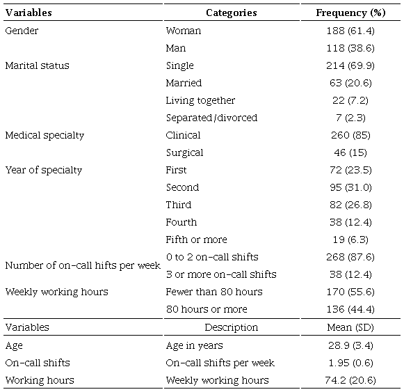 The initial sample obtained comprised 312 resident physicians from the GMA. Six surveys were excluded from the final analysis due to errors in their completion or incomplete data, leaving a total of 306 residents included as a final sample, equivalent to 11.23% of the total residents in the GMA (n = 2724).