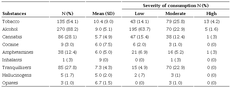 For the early identification of health risks and disorders due to substance use, the WHO ASSIST V-3 test was administered, consisting of eight items on recent (past three months) and lifetime use of 10 different substances (tobacco, alcohol, cannabis, cocaine, amphetamines, or other stimulants, anxiolytics, hallucinogens, inhalants, and other drugs). The score obtained makes it possible to classify individuals according to the risk level for each substance: low, moderate, or high (World Health Organization [WHO], 2011).