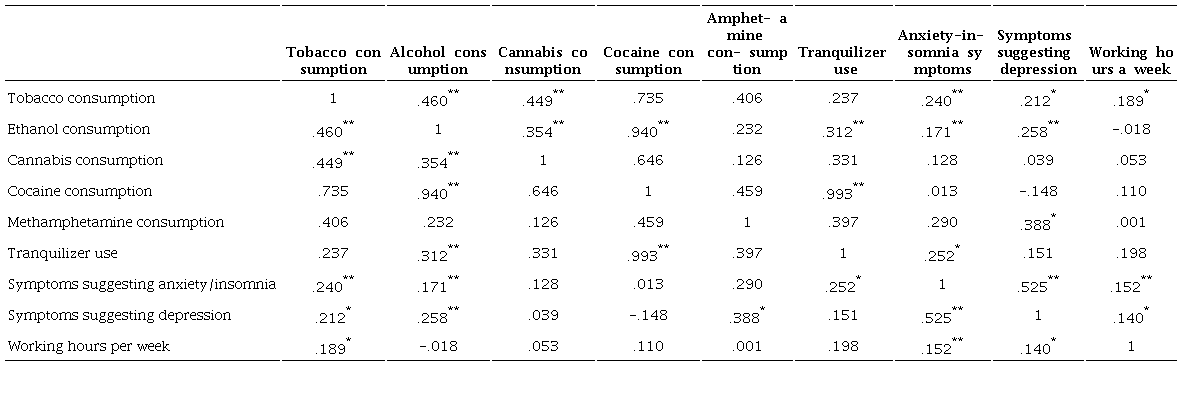 Statistically significant differences (p < .05) were observed in the ethanol consumption score in the comparison between men and women (10.2 ± 6.0 vs. 8.2 ± 4.3, respectively), and in those with over 80 and fewer than 80 HWW in the scores obtained in the consumption of tobacco (12.5 ± 10.2 vs. 8.8 ± 7.7, respectively), and tranquilizers (8.4 ± 5.1 vs. 6.5 ± 3.3, respectively). After the correlation analysis between the ASSIST scores, the scores for anxiety and depressive symptoms in GHQ 28 and HWW had been performed, a high correlation (r = .99) was found for the consumption of cocaine and tranquilizers and for the consumption of cocaine and ethanol (r = .94), as well as a statistically significant correlation between the consumption of methamphetamine and depressive symptoms (r = .388) and the consumption of tranquilizers and anxiety symptoms (r = .252); the remaining correlations are shown in Table 3. However, when Spearman’s test was used to identify correlation levels between cocaine users (n = 9), tranquilizer users (n = 85) and, ethanol users (n = 270) no results were found to be statistically significant.