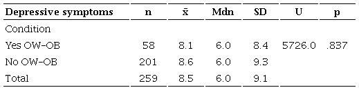 To respond the specific objective 1 that indicates to verify if the DS are different according to whether or not the child presented OW-OB, the Mann-Whitney U test was applied. No significant differences were found (U = 5726.0, p > .05) (Table 2).
