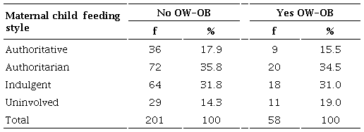 The median of demandingness (2.57) and responsiveness (1.16) were obtained in order to describe the MCFS, and according to this, high or low were identified and the participants were classified in one of the four MCFS. An authoritarian style was found in 35.5% (n = 92), followed by indulgent style 31.7% (n = 82) (Table 1). Regarding children, 52.1% (n = 135) were male and 47.5% (n = 123) female, average age of 4.39 years old (SD = .69), 22.4% (n = 58) presented OW-OB and 62.2% (n = 161) normal weight.