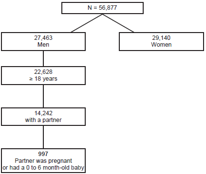 For the aim of this study, a sample of 997 perinatal fathers (515 during pregnancy and 482 in the postpartum period) was selected based on the following criteria: a) men who reported having a partner; b) were > 18 years old; and c) whose partner was pregnant or in the first six months postpartum period (Figure 1).