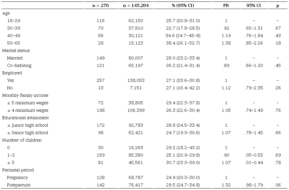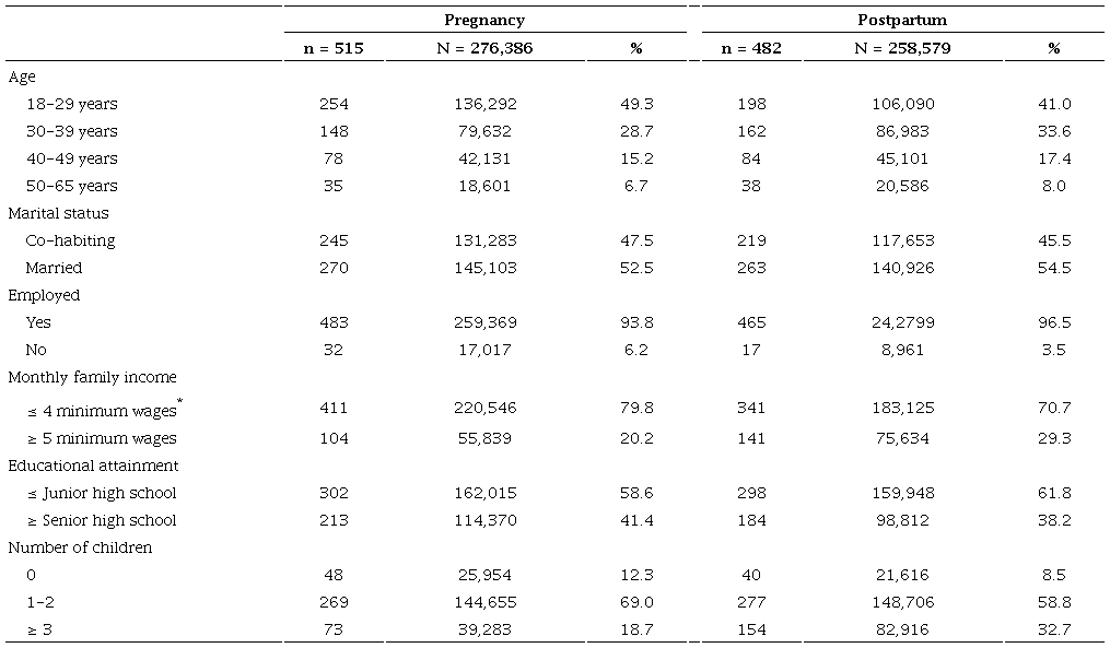 Table 1 shows the demographic characteristics of the sample. As can be seen, participants were mostly young (19-29 years) and over half were married (52.5% pregnancy and 54.4% postpartum). Few participants were unemployed (6% pregnancy and 3% postpartum). Over half had a monthly family income of ≤ 4 minimum wages (79.8% pregnancy and 70.7% postpartum) and an educational attainment of ≤ Junior high school (58.6% pregnancy and 61.8% postpartum). The majority had one or two children (69% pregnancy and 58.8% postpartum).