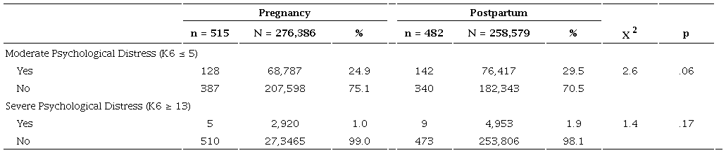Moderate psychological distress prevalence was 24.9% (pregnancy) and 29.5% (postpartum period), with no significant differences being observed between these periods. As for severe psychological distress, 1.0% presented this condition in pregnancy and 1.9% in the postpartum period, with no statistically significant differences (Table 2).