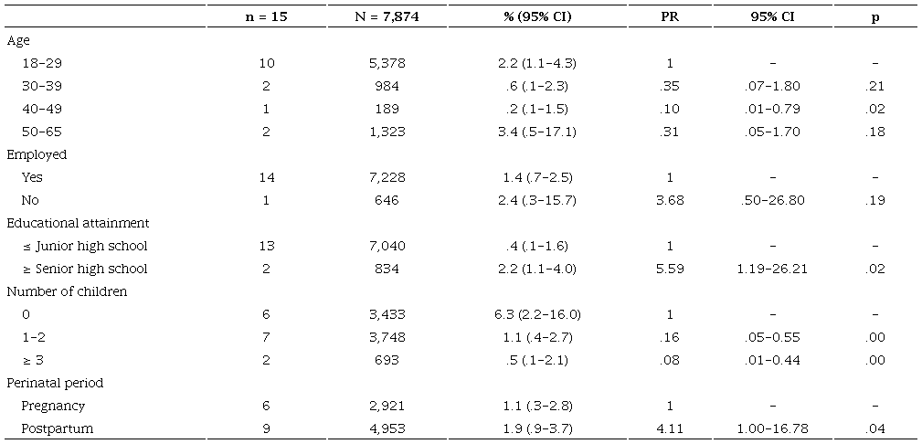Sociodemographic data: age, marital status, employment status (unemployment was defined as not having engaged in paid employment in the past 30 days), income, educational attainment, number of children, and perinatal period (pregnancy/postpartum).5