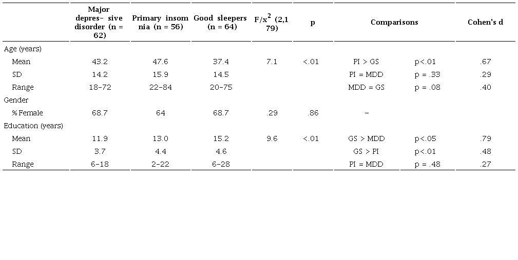 One hundred and eighty-two individuals participated in the study: 62 patients with major depressive disorder (MDD), 56 patients with primary insomnia (PI), and 64 good sleepers (GS). While there were no significant gender differences among the groups, patients with PI were significantly older than GS, who, in turn, had significantly more schooling years than PI and MDD patients (Table 1).