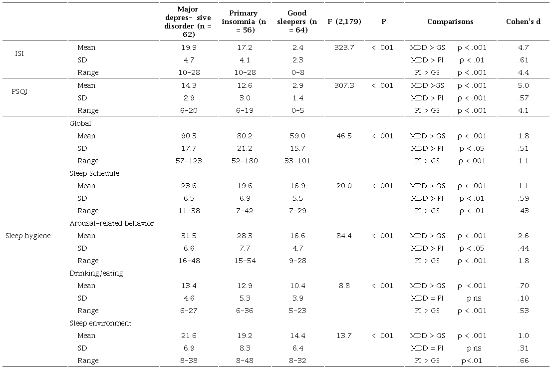 Method: One hundred and eighty-two adult individuals participated: 62 outpatients with major depressive disorder with comorbid insomnia (MDD), 56 outpatients with primary insomnia (PI), and 64 good sleepers (GS). All participants were assessed with a structured psychiatric interview, an insomnia interview, the Pittsburgh Sleep Quality Index, the Insomnia Severity Index, and the Sleep Hygiene Practice Scale. We compared the practice of SH as a whole and by domains between the groups and the relation between SH practice, insomnia, and sleep quality.