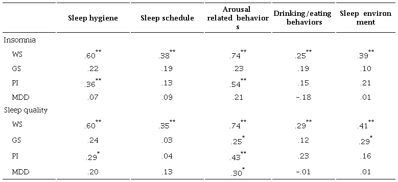 Discussion and conclusion: Although patients with insomnia comorbid with MDD or with PI have a worse SH practice than GS, only arousal-related behaviors and drinking/eating habits contribute significantly to insomnia severity and sleep quality.