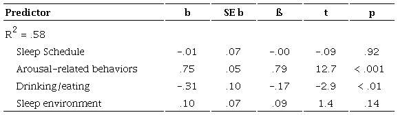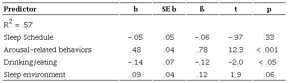 The results of the linear regression analyses are shown in Tables 4 and 5. More than a half of the variance in insomnia severity was explained by the model (R2 = .58, F (4, 177) = 61.1, p < .001). However, only arousal-related behaviors (ß = .79, p < .001) and drinking/eating habits (ß = -.17, p < .01) significantly contributed to the model. In the second regression analysis, again, 57% of the variance in sleep quality scores was explained by the predictors together (R2 = .57, F (4, 177) = 59.4, p < .001); but only arousal related behaviors (ß = .77, p < .001) and drinking/eating behaviors (ß = -.12, p < .05) were significantly associated with sleep quality.