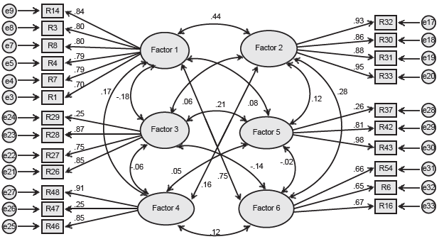 The confirmatory factor analysis made up of 23 items and six factors showed a χ2/df = 2.0, GFI = .85, CFI = .92 RMSEA = .06 and SRMR = .06, as well as a TLI of .91, which indicates that at least 91% of the covariance of the data can be reproduced by the model. These indicators allow for the assertion that the model has a good fit (Bentler, 1990; Byrne, 2016; Hu & Bentler, 1999). The standardized factor weights and the covariances between the factors are shown in Figure 1.
