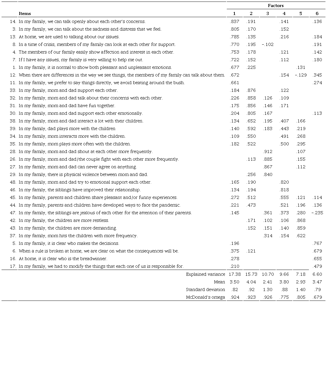 The final items show adequate theoretical congruency and good fit indicators. Factors 1, 2, 4, and 6 allude to adaptive family coping in the face of the pandemic. Factors 1 and 6 refer to the total family system (Minuchin & Fishman, 2006). Factor 2 corresponds to the conjugal subsystem and Factor 4 to the fraternal subsystem. Therefore, the family resources were differentiated by studying the subsystem. This highlights the complexity of being a part of a subsystem with certain characteristics depending on the functions of each member with the objective of preserving the continuity of the family system.