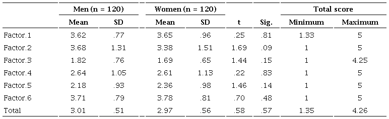 A Student’s t-test was done to understand if the total score or the found dimensions from the validity process tended to vary depending on the sex of participants using the same sample that was used for the confirmatory factor analysis. Results from the analysis did not show any significant differences for the subdimensions or the total scores. These results can be seen in Table 2.