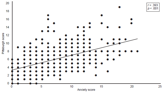 Figure 1 shows the positive correlation (p < .001) of sleep quality and symptoms of anxiety (Pearson's correlation, r = .393) of adolescents.