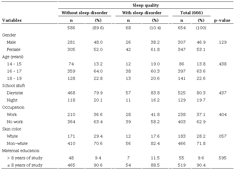 Method: Cross-sectional study integrating school-based epidemiological research with a representative sample (n = 666) of high school students (14 to 19 years old) in public schools in the municipality of Caruaru-PE. The translated versions into Portuguese of the Pittsburgh Sleep Quality Index (PSQI) and the Hospital Anxiety and Depression Scale (HAD) were applied to analyze sleep quality and anxiety, respectively. Binary logistic regression was used to analyze the association, considering sleep quality as an outcome.