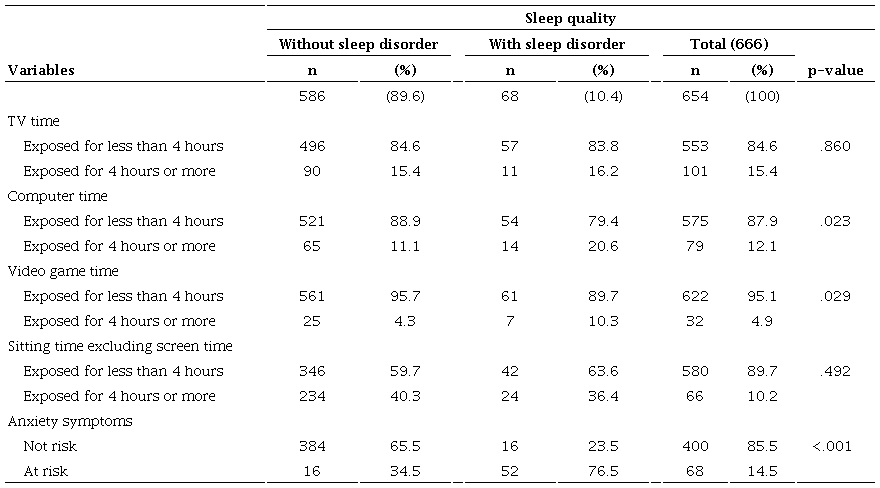 A total of 687 students from nine schools in the municipality of Caruaru-PE, were interviewed. The final sample was 666 adolescents after 14 refusals by parents and students, and the exclusion of seven questionnaires from students under the age of 14 and over 19, where most were female (53.1%), aged between 16 and 17 years (63.6%), who studied during the day (80.3%), did not work (62.9%), and had maternal education of less than or equal to eight years of study (90.4%). The prevalence of sleep disturbances among adolescents was 10.4%, of which 76.5% were at risk of having anxiety symptoms. The other socio-demographic and sedentary behaviors characteristics of the adolescents are shown in Tables 1 and 2. It must be emphasized that some variables have a lower quantity than the final sample, since, in order to respect their ethical rights, some students chose not to answer some questions, classified as missing.