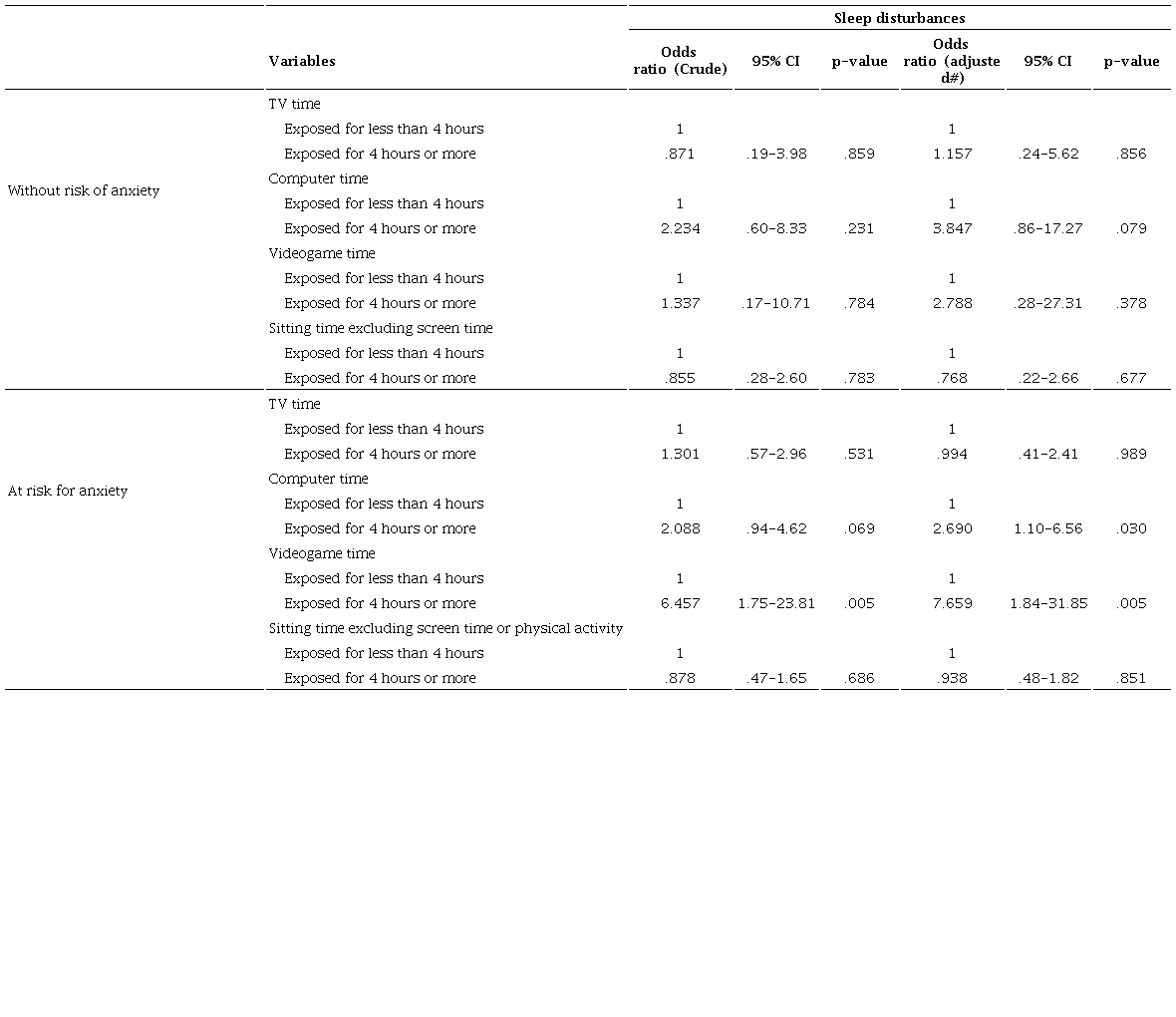 After the interaction test and verification of the anxiety level as a moderating variable, the results of the crude and adjusted odds ratio for the explicative variables (gender, age, skin color, and school shift) were stratified by the anxiety level of adolescents (without risk of anxiety and at risk of anxiety). After adjustment, sleep disorder was significantly associated with computer exposure time (OR = 2.337; CI 95% [1.01, 5.43]) and video game (OR = 8.083; CI 95% [2.0, 32.8]) only in adolescents at risk of anxiety symptoms, as shown in Table 3.
