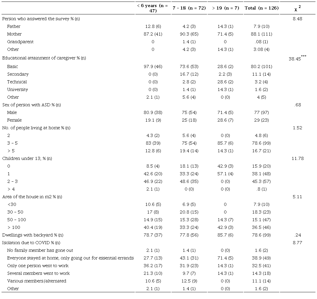 Family and household characteristics. As can be seen in Table 1, the most common respondents were the mothers of people with ASD, who had completed basic education. Of the households surveyed, most comprised three to five members, with children under the age of 13 living at home. A similar proportion of subjects reported that they only left the house for essential errands or work. There were no significant differences between the three age groups as regards family and household characteristics, except for the educational attainment of the caregivers. Further details on the demographic characteristics of the sample are provided in Table 1.