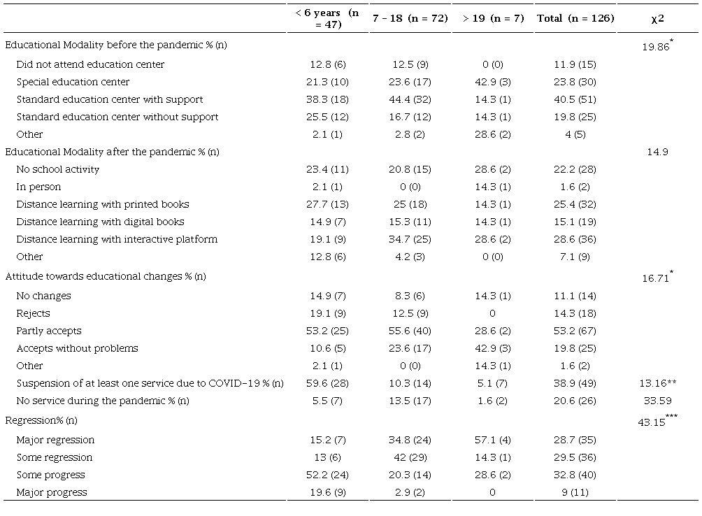 Educational modalities and changes in therapeutic service administration. Once the COVID-19 lockdown began, more than half the individuals received distance education, usually through interactive platforms. Caregivers reported a 10% increase in people with ASD who were not engaged in any school activity after the COVID-19 lockdown was enforced. Those who continued with school activities partially or without problems accepted the educational changes. Most caregivers reported “a major” or “some” regression in the behavior of their children with ASD once lockdown began. A comparison of the age groups found that those under six partly accepted educational changes more frequently than the rest of the ages (χ2 = 16.71, p < .05). Likewise, caregivers of this age group reported the greatest progress, with the greatest regression being observed in the group of schoolchildren and adults (χ2 = 43.15, p < .001). Further details about the educational modalities and changes in services received are available in Table 2.