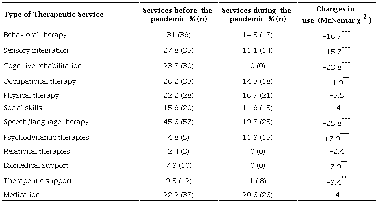 Changes in service use frequency after COVID-19. As can be seen in Table 3, speech/language and behavioral therapy were the types of therapy most commonly used before the onset of the pandemic. Service suspension occurred in a third of subjects due to lockdown, while a smaller number had not received any service since the start of the pandemic, with the highest percentage of suspension being reported in those under 6 (χ2 = 13.16, p < .01). Once the COVID-19 lockdown began, caregivers reported that speech/language therapy and physical therapy were the most commonly used services, while relational therapies, cognitive rehabilitation and biomedical treatments were the least commonly used ones with no participants. As Table 3 shows, nine of the 15 services showed a significant reduction in use. The services in which the greatest changes were observed were school support and speech/language therapy. Conversely, psychodynamic therapies were the only ones that experienced an increase in use (p < .001) although they continued to be among the least utilized.