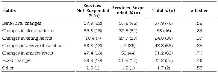 Results: Suspension of at least one service was reported for 38.9% of subjects, with no significant association being found between symptom worsening and service administration modality.