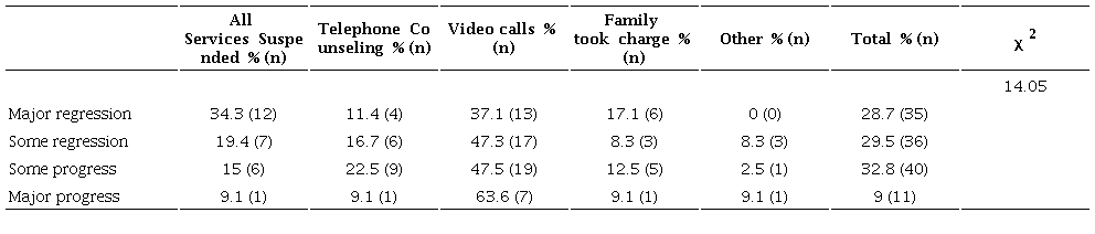 Changes in externalized and internalized behaviors and habits. Externalized behaviors with the greatest increase were dysfunctional behaviors, whereas the most frequent internalized behaviors were anxiety and withdrawal (Table 4). There were no significant differences between externalized and internalized behaviors by age group or gender. A series of Fisher tests, to determine whether changes in externalizing and internalizing behaviors were a function of the suspension of services received by people with ASD found no significant increase in externalizing and internalizing behaviors in individuals whose services had been suspended. Likewise, a multinomial regression failed to reveal significant associations between the reports of regression in the behaviors of people with ASD and the service administration modality (face-to-face vs. distance treatments; χ2 = 14.64, p > .05). However, those who experienced total suspension of services due to the pandemic reported the greatest regression, while those who continued to receive services via video calls reported the greatest progress (Table 5).
