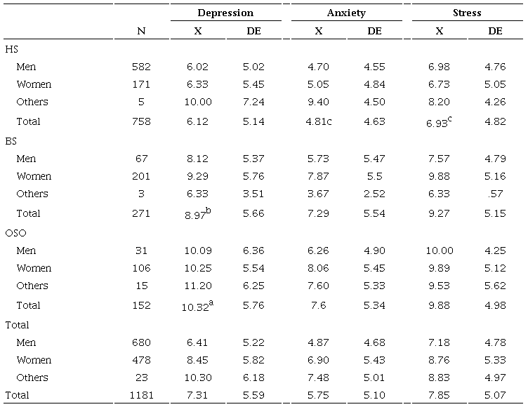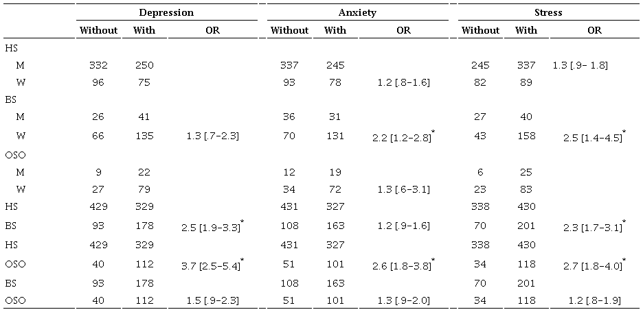 When using the cut-off points considered for the possible presence of a disorder (Table 3), results show that, in general, these are high, even reaching percentages above 70% in the case of the OSO population, for participants with values above the cut-off point in depression and stress. OSO show a ratio of people above the cut-off point higher than those reporting themselves as bisexual and homosexual. Similarly, bisexuals show a greater ratio of people over the cut-off point than gays and lesbians.