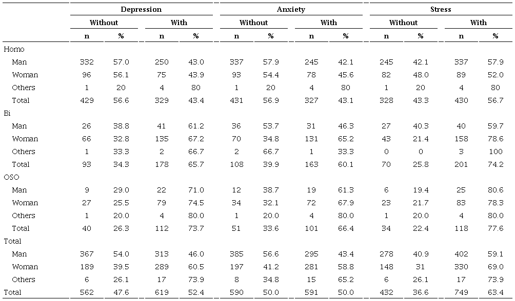 Results: Lower levels of mental health were identified among the bisexual and other sexual orientations (pansexual, demisexual, asexual, etc.) population as compared with gays and lesbians, finding a greater presence of depressive symptoms (p = .000), anxious (p = .000) and related to stress (p<.001). Similarly, bisexual women are more likely to present symptoms associated with mental health disorders than men, as lesbians do, as compared with gays in the case of anxiety. Gays are at a higher risk of stress than lesbians.