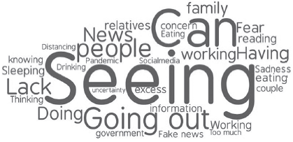In the word cloud (Figure 1), the words most frequently mentioned by subjects were: seeing (655), being able to (479), people (333), and going out (331). They are all interrelated and expressed the way life changed during lockdown and the feeling of a lack of control due to being limited, as well as the difficulty of having face-to-face contact with other people (See/not see): “Not being able to see friends and family,” “not being able to go out freely ...” Subjects were also upset by seeing people who do not do the right thing, follow safety measures, and who fail to wear mouth covers, or adopt other practices, suggesting they do not believe the virus exists, which in turn causes a risk of infection; in essence “Seeing people who do not follow the norms.” It should be noted that only 1.9% reported not having experienced any discomfort during confinement.