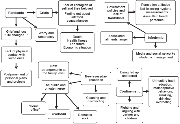 Figure 2 shows the categories analyzed considering the context of the responses. As can be seen, the pandemic represents a crisis whose repercussions have been traumatic for some people due to the drastic change it has caused in their life dynamics. A central category in this experience is fear, both of becoming infected and of infecting one’s loved ones and the implicit concern about the high risk of death, coupled with the uncertainty associated with the economic situation and the future in relation to work, both in those who had a job and those who did not, such as “Worrying someone in my family will lose his/her job,” “That people will be out of work,” “That I have not been able to get a job.” This is a sample of the experiences that were lived both individually and collectively.