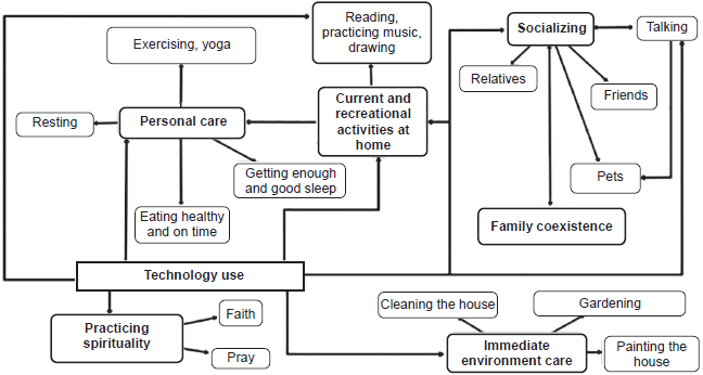 However, as time went by, due to the absence of fixed schedules, what was initially valued as the possibility of coinciding and sharing with the family segued into other problems, such as a sedentary lifestyle, poor health, and disrupted sleep and eating habits. At the same time, lockdown and sharing the same space for a long time had implications for family relationships, triggering conflicts over having a place to carry out academic and work activities. Adapting to technological resources was a major challenge since it required having equipment that was usually shared with other family members without having digital services for support which sometimes led to arguments and violence between family members. All this translated into discomfort for the subjects expressed as concern, fear, anger, “wanting to scream” and loneliness. These findings coincide with what has been reported in other studies on actions concerning discomfort and well-being because of lockdown (Brooks et al., 2020; Rodríguez-Rey et al., 2020; Pfefferbaum & North, 2020; Sandín et al., 2020).