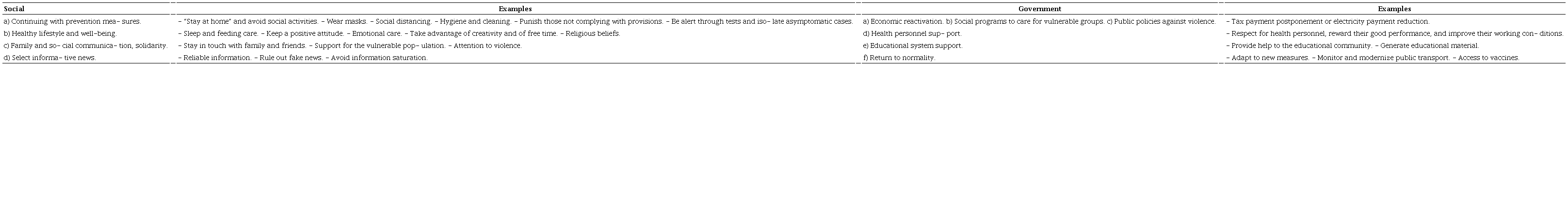 Table 1 summarizes the measures suggested by subjects to deal with the pandemic which mainly target the government and society. Subjects are divided regarding the public policies adopted by the federal government. Some criticize the decisions of the government during the pandemic while others defend these measures and approve of its recommendations. Six dimensions were associated with the government, those being reactivation of the economy, social programs to care for vulnerable groups, public policies against violence, support for health personnel as well as for the educational system, and the return to normality. Finally, solidarity and mutual support became important for strengthening community support networks, especially to maintain interpersonal closeness with family members, friends, and vulnerable groups living in violent situations.