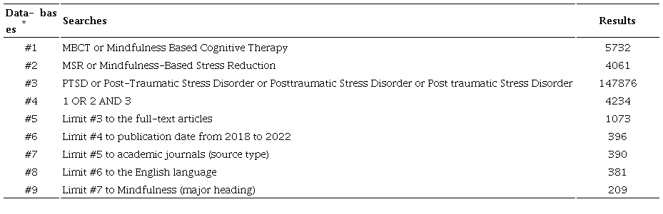 The CINAHL Complete, PsycINFO, Medline, and PsycArticles databases were searched to select studies for inclusion in this review. Search keywords used were MBCT or Mindfulness-Based Cognitive Therapy OR Mindfulness-Based Stress Reduction or MBSR AND Post-Traumatic Stress Disorder or PTSD, looking for full-text articles from 2018 up to march 2022. Details of the databases and search strategy are provided in Table 1.