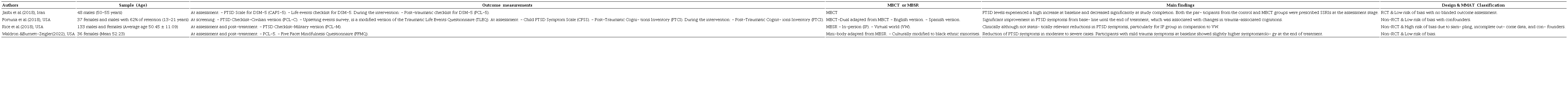 With regards to PTSD outcome measures, all studies used the post-traumatic checklist for DSM-5 (PCL-5) or its variations, although the methodology varied with regards to the application of this measurement, with only two applying the questionnaire at the assessment and post-treatment stage (Rice et al., 2018; Waldron & Burnett-Zeigler, 2022). The PCL-5 consists of a 20-item self-assessment questionnaire of symptoms related to the five dimensions identified in PTSD, where answers are given on five-point Likert scales ranging from 0 (not at all) to 4 (extremely; Blevins, Weathers, Davis, Witte, & Domino, 2015). Expanding on its variations, Fortuna et al. (2018) applied the PTSD Checklist-Civilian version (PCL-C), a 17-item version of the PCL recommended for civilian populations where multiple traumas are present (Blanchard, Jones-Alexander, Buckley, & Forneris, 1996). Rice et al. (2018) used the PTSD Checklist-Military version (PCL-M), a 17-item self-report focused on stressful military experiences (Blanchard et al., 1996).