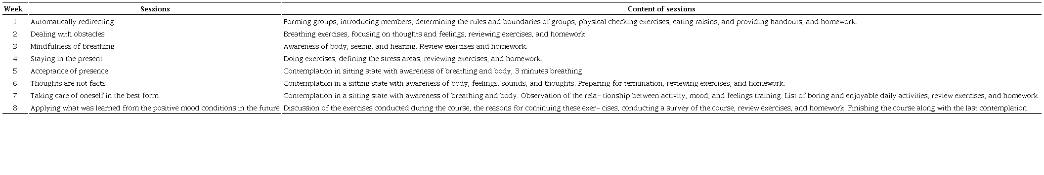 Jasbi et al. (2018) delivered MBCT in a group format of 8-week, where each weekly session lasted between 60 to 70 minutes and the group size varied from 7 to 12 participants. The content of the MBCT sessions is detailed in Table 3.