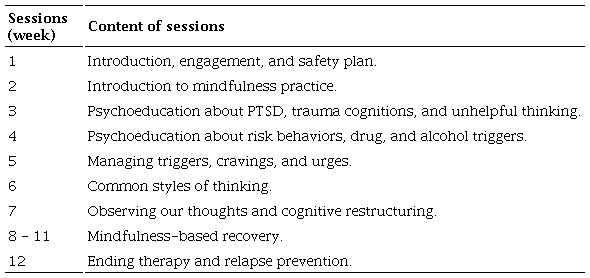 Fortuna et al. (2018) used a TF-CBT adaptation for adolescents known as MBCT Dual, combining MBCT with relaxation and breathing retraining (Rosenberg, Jankowski, Fortuna, Rosenberg, & Mueser, 2011). The intervention is conducted in a group format intended to last for 12 weeks although the study only had a 6-week retention. Weekly therapy sessions were 50 to 60 minutes in length. It is worth mentioning that the intervention was delivered in Spanish to 11 of the participants, who were primarily Spanish monolinguals. An overview of MBCT-Dual therapy sessions is provided in Table 4.