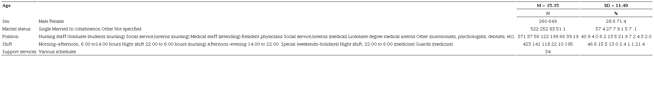 The results include data from 909 health professionals from 24 medical services and five shifts, with an average age of 35.35 years and a standard deviation of 11.49. Of the participants, 464 were students and staff from the nursing area, 426 from the medical area, and 19 from nutrition, dentistry, and psychology (Table 1).