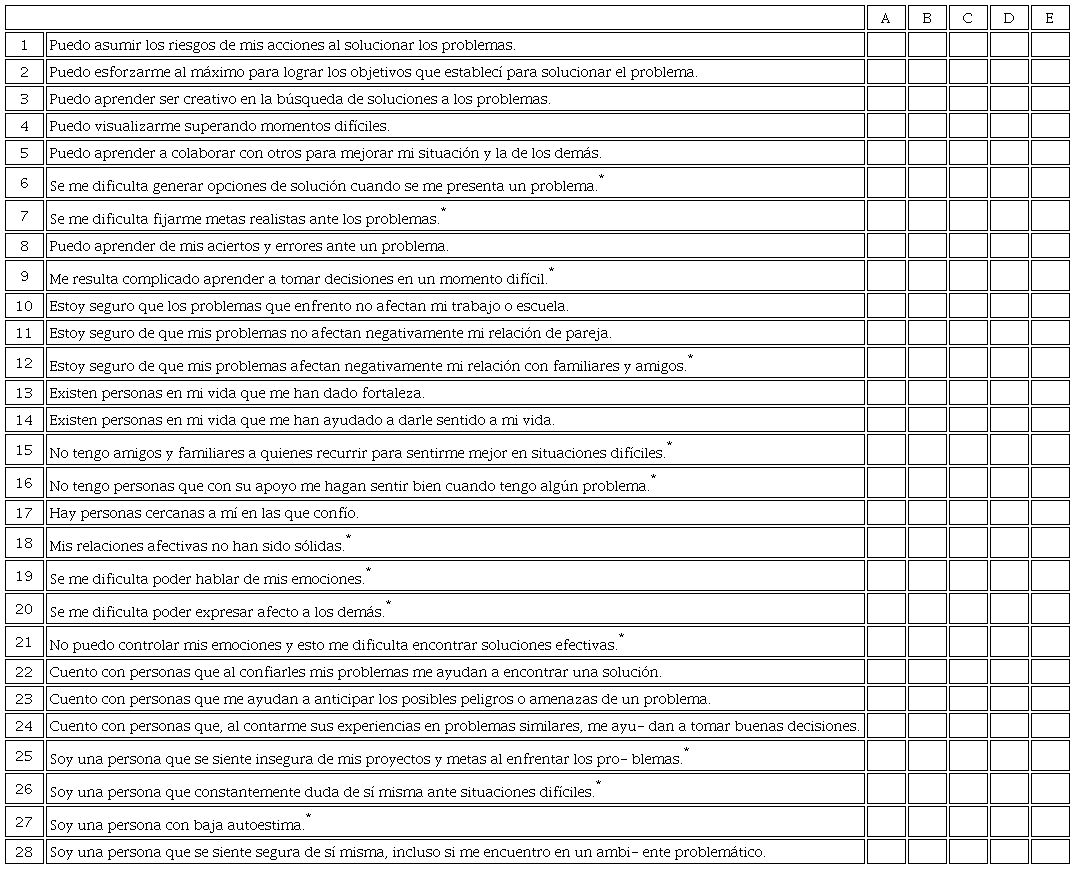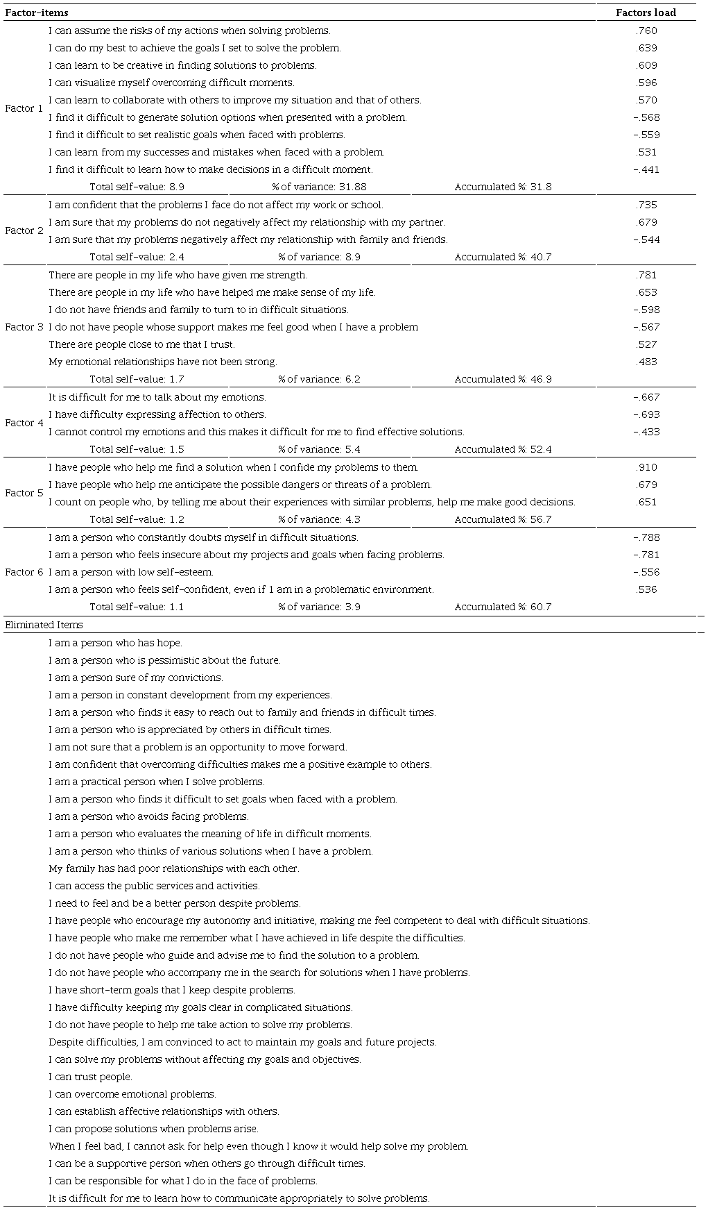 The exploratory factor analysis led to eliminating over because their factor load did not exceed the established limit of .40 or grouped into factors with two or fewer items. This procedure left 28 items with five response options, from 1 “totally disagree” to 5 “totally agree”. The items belong to six factors, obtaining, through the sum, a total score on the resilience capacity in the face of problematic situations (resilient response) and each factor that composes it. The items whose rating is reversed are; 6,7,9,12,15,16,18,19,20,21,25, 26, and 27.
