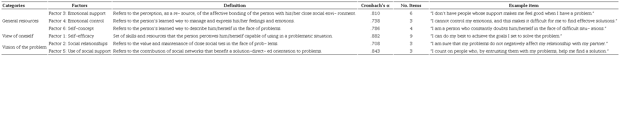 According to the characteristics of their items, the factors obtained were theoretically matched with the resilient response model which supports the original instrument, as follows; General Resources (Factor 3, 4, and 6), Vision of oneself (Factor 1) and Vision of the problem (Factor 2 and 5).