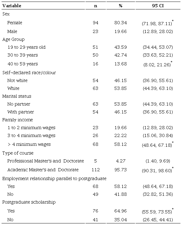 A total of 117 students who were only doing postgraduate healthcare courses in the State of Mato Grosso participated in this research. The socio-demographic profile was 80.34% women, 43.59% aged between 19 and 29 years old, 53.85% self-reported as being of white race/colour, 53.85% had no partner, and 58.12% had a monthly income greater than four times the minimum wage. Regarding their studies, 95.73% were pursuing an academic master’s or doctoral degree, 58.12% had an employment relationship parallel to the graduate course, and 64.96% had scholarships. The socio-demographic information is represented in Table 1.