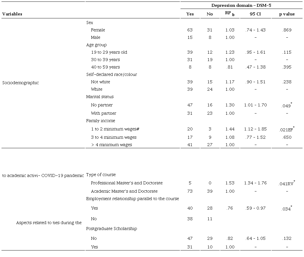 Método: Se trata de un estudio transversal con estudiantes de posgrado en salud, con una muestra de 117 participantes. Los datos fueron recolectados a través de un formulario en línea, entre septiembre y noviembre de 2021, utilizando cuestionarios semiestructurados con información sociodemográfica e información sobre la salud mental de los participantes, según lo definido por la Escala DSM-5, donde el dominio depresión fue considerado una variable para este estudiar. Las variables se probaron mediante el modelo de regresión múltiple de Poisson con varianza robusta en el análisis bivariado entre las variables dependientes e independientes (IC 95%).