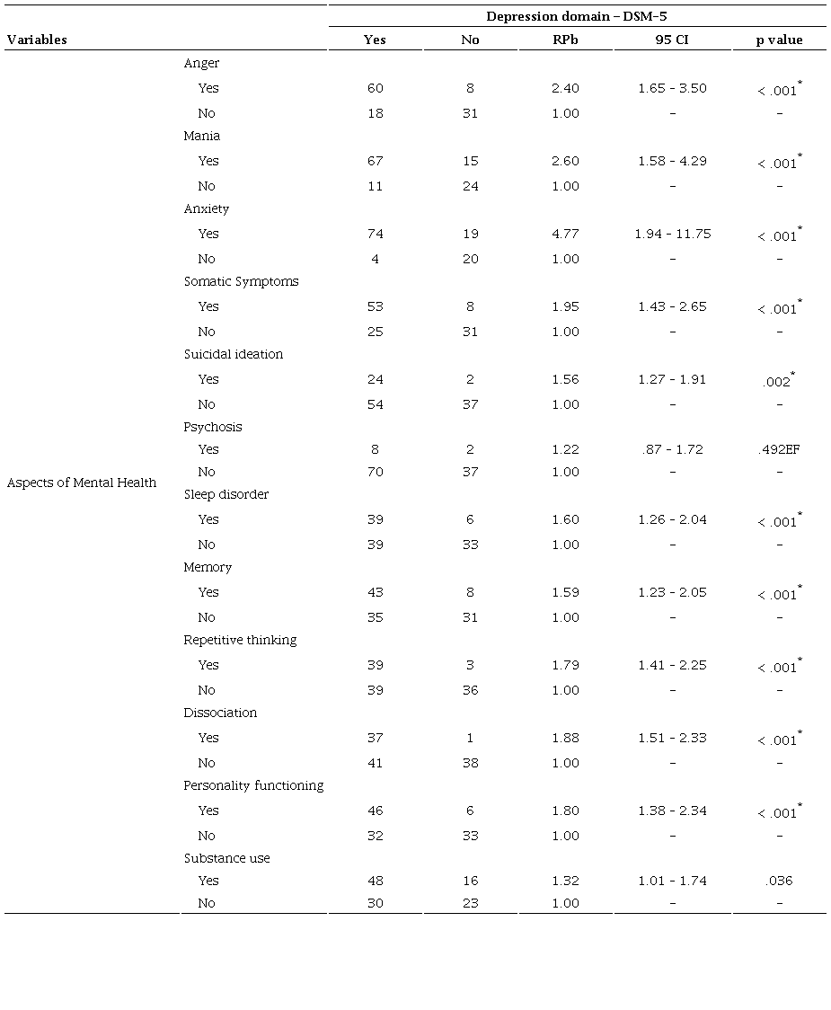 With the emergence of the pandemic, changes in daily life, fear, and uncertainties demanded immediate responses from populations, which generated emotional and psychological reflexes, whose emotions resulted in significant consequences in terms of mental health (Haddad et al., 2021). Thus, an association was also observed between depression and other domains of the DSM-5, anger, mania, anxiety, somatic symptoms, suicidal ideation, sleep disorders, memory, repetitive thoughts, dissociation, personality functioning, and substance use in the population of this study.