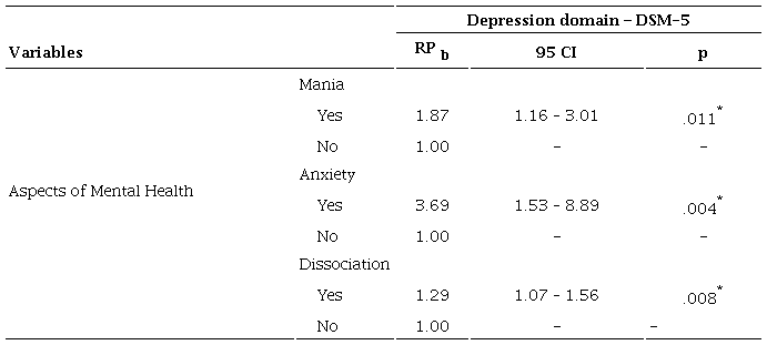Through Multiple Poisson Regression, the final model was adjusted between the depression domain variables and the health status variables, with their respective prevalence values and adjusted confidence intervals. Analyzing the health status variables, it was found that mania, anxiety, and dissociation were statistically associated with depression during the multiple analysis (p < .05). In this analysis, all variables were risk factors for depression and anxiety had the highest risk (PRa = 3.69) compared to the mania and dissociation domains (Table 4).