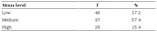 To measure the stress produced by the clinical practice stressors, the total sum of the items was carried out to later classify the data into three low (25), medium (50), and high (75) percentiles, finding that more than 50% of the participants report a medium level of stress and 15.4% show a high level (Table 1).