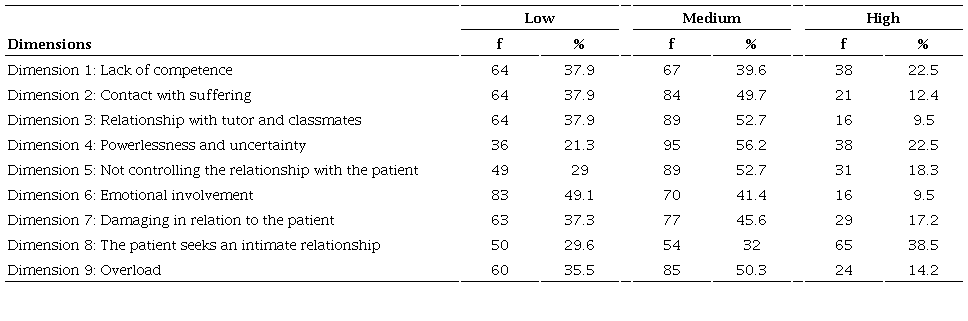 Dimension 3-Relationship with tutor and classmates (items 1,12,19,20,25,28): low (0-6 points), medium (7-12 points), high (13-18 points).