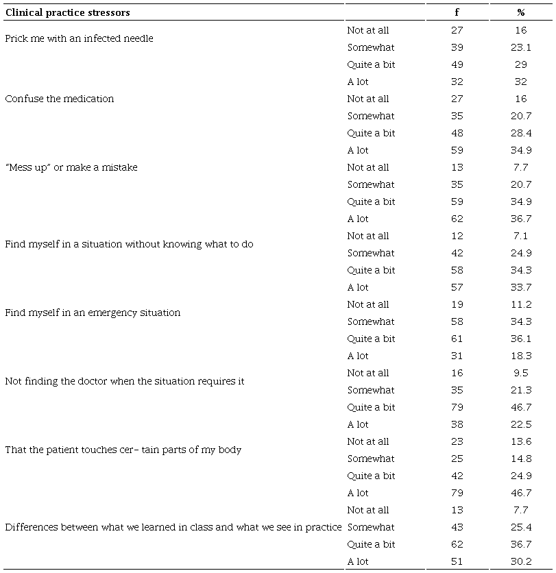 Regarding the stressors that cause between a lot and a lot of stress, the students refer to more than 30% that pricking themselves with an infected needle causes them stress; being wrong; not knowing what to do; being in an emergency; the differences between what is learned in theory and reality when executed in practice. As well as, 46.7% are stressed not to find the doctor when needed and that the patient touches some part of her body (Table 3).